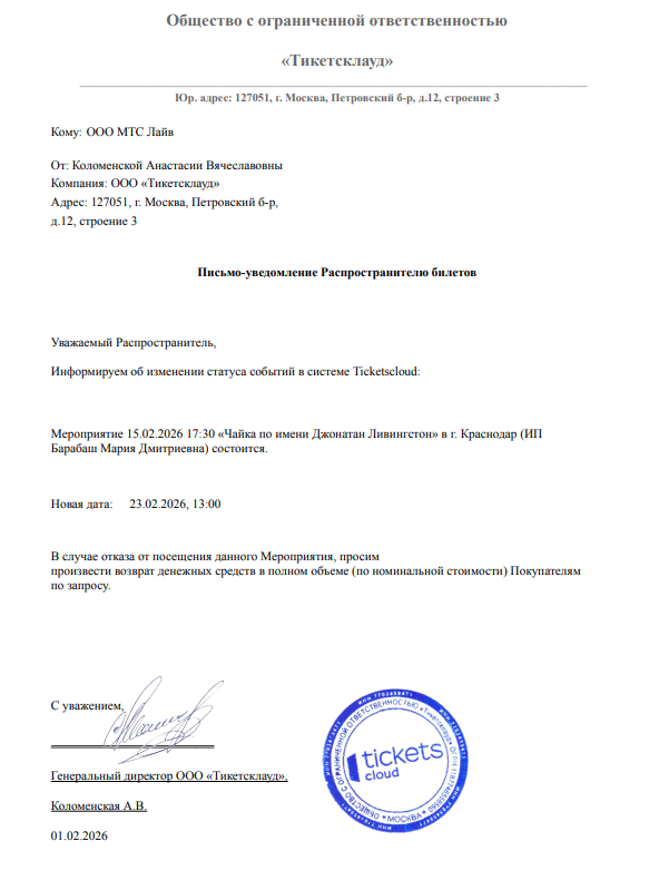 Уважаемый клиент! Спешим сообщить, что по информации, полученной от организатора, спектакль «Чайка по имени Джонатан Ливингстон», запланированный на 15.02.2026 в 17:30 в Театре «Veritas», переносится на 23.02.2026 в 13:00. Ранее приобретенные билеты действительны, обменивать их не нужно. Если вам не удобно посетить мероприятие, вы можете вернуть билет по кнопке в личном кабинете во вкладке «Заказы». Деньги за электронные билеты вернутся автоматически в полном объёме на карту, с которой была произведена оплата. Если вы купили билет в кассе Ticketland.ru за наличный расчет, то обратитесь, пожалуйста, на почту: vozvrat@ticketland.ru. С уважением, команда поддержки Ticketland.