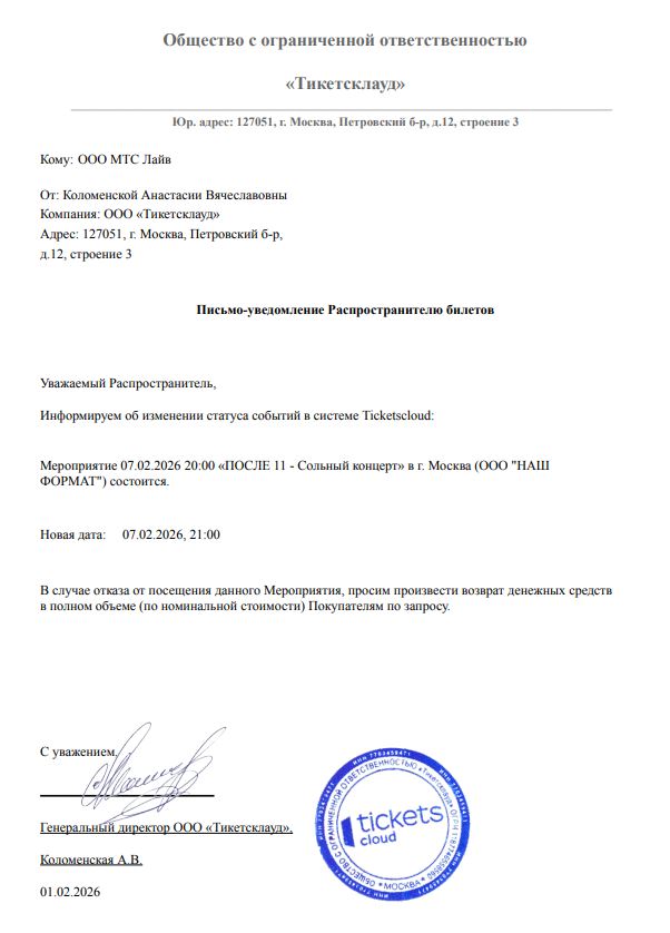 Уважаемый клиент! Спешим сообщить, что по информации, полученной от организатора, сольный концерт группы «После 11», запланированный на 7 февраля 2026 года в 20:00 в клубе «Life Pub», перенесен на 21:00. Ранее приобретенные билеты действительны, обменивать их не нужно. Если вам не удобно посетить мероприятие, вы можете вернуть билет по кнопке в личном кабинете во вкладке «Заказы». Деньги за электронные билеты вернутся автоматически в полном объёме на карту, с которой была произведена оплата. Если вы купили билет в кассе Ticketland.ru за наличный расчет, то обратитесь, пожалуйста, на почту: vozvrat@ticketland.ru. С уважением, команда поддержки Ticketland.